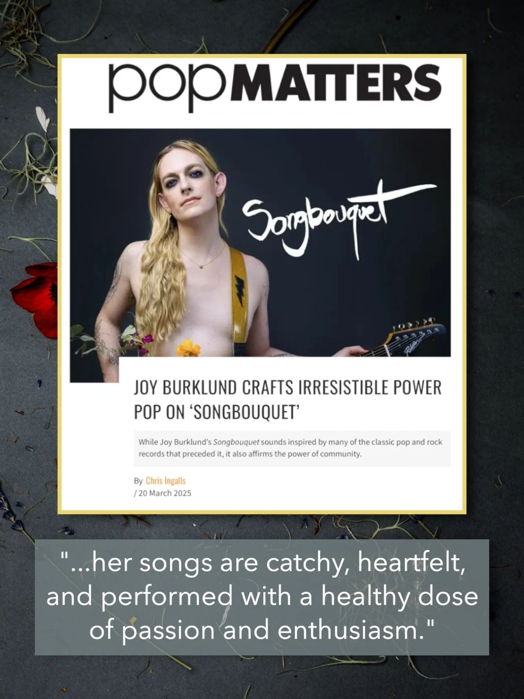 Ranging from emotional, Americana-tinted ballad (“Not Gonna Fall”), to reflective fingerpicked confessional (“Next Life”), to massive, sunshine-optimist rock anthem (“Sunrays”), Songbouquet is a bold, trans-genre debut that centers joy’s dynamic vocal performance. Her playfully introspective lyrics call back to the anti-folk tradition of artists like the Moldy Peaches, Regina Spektor, and Diane Cluck, while her propulsive, energetic guitar riffs evoke indie punk acts like Ted Leo and the Pharmacists and The Thermals.