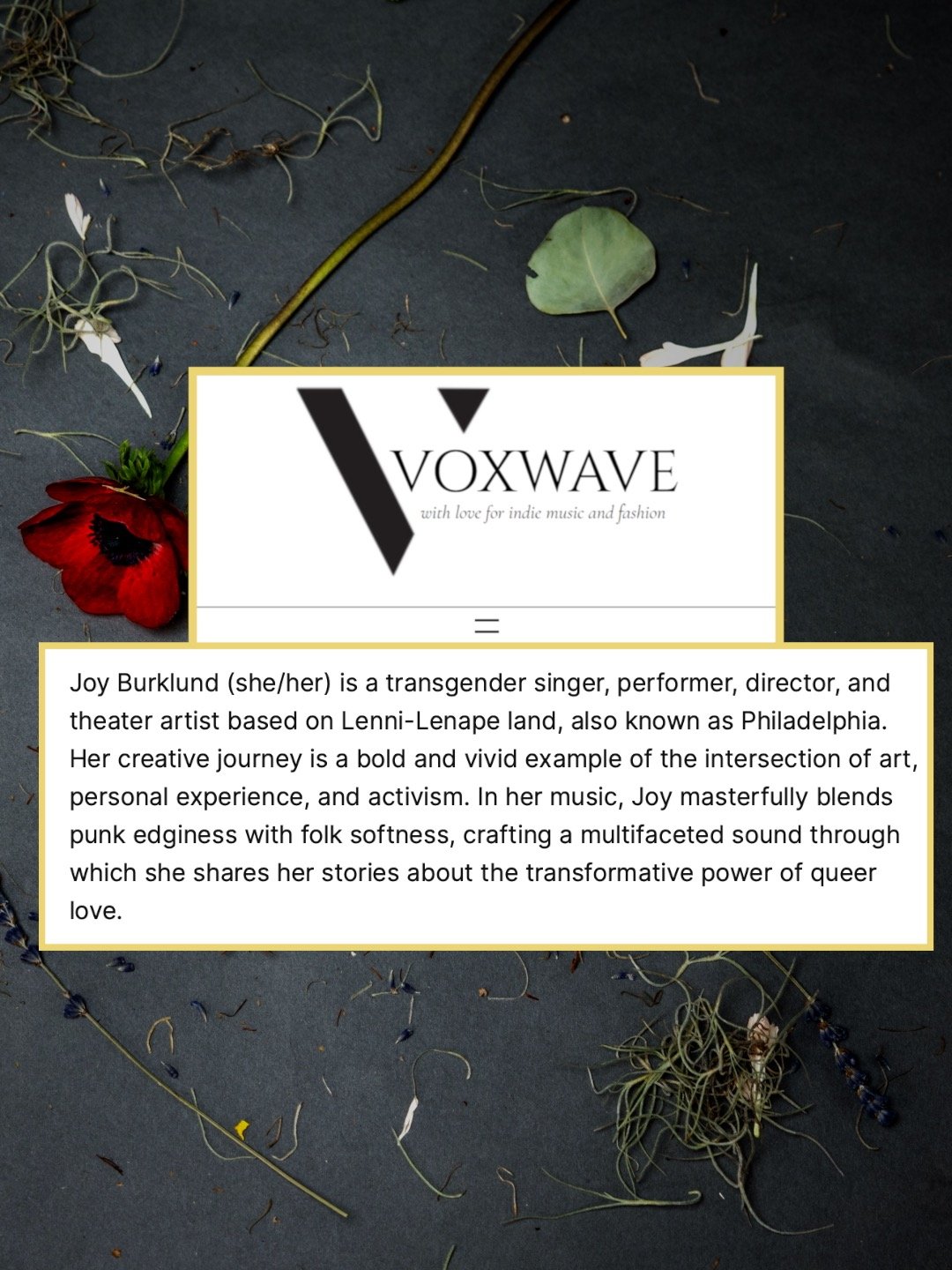 joy burklund (she/her) is a trans songstress, performer, filmmaker, and theater artist living on unceded lands of the Lenni-Lenape, also known as Philadelphia.
