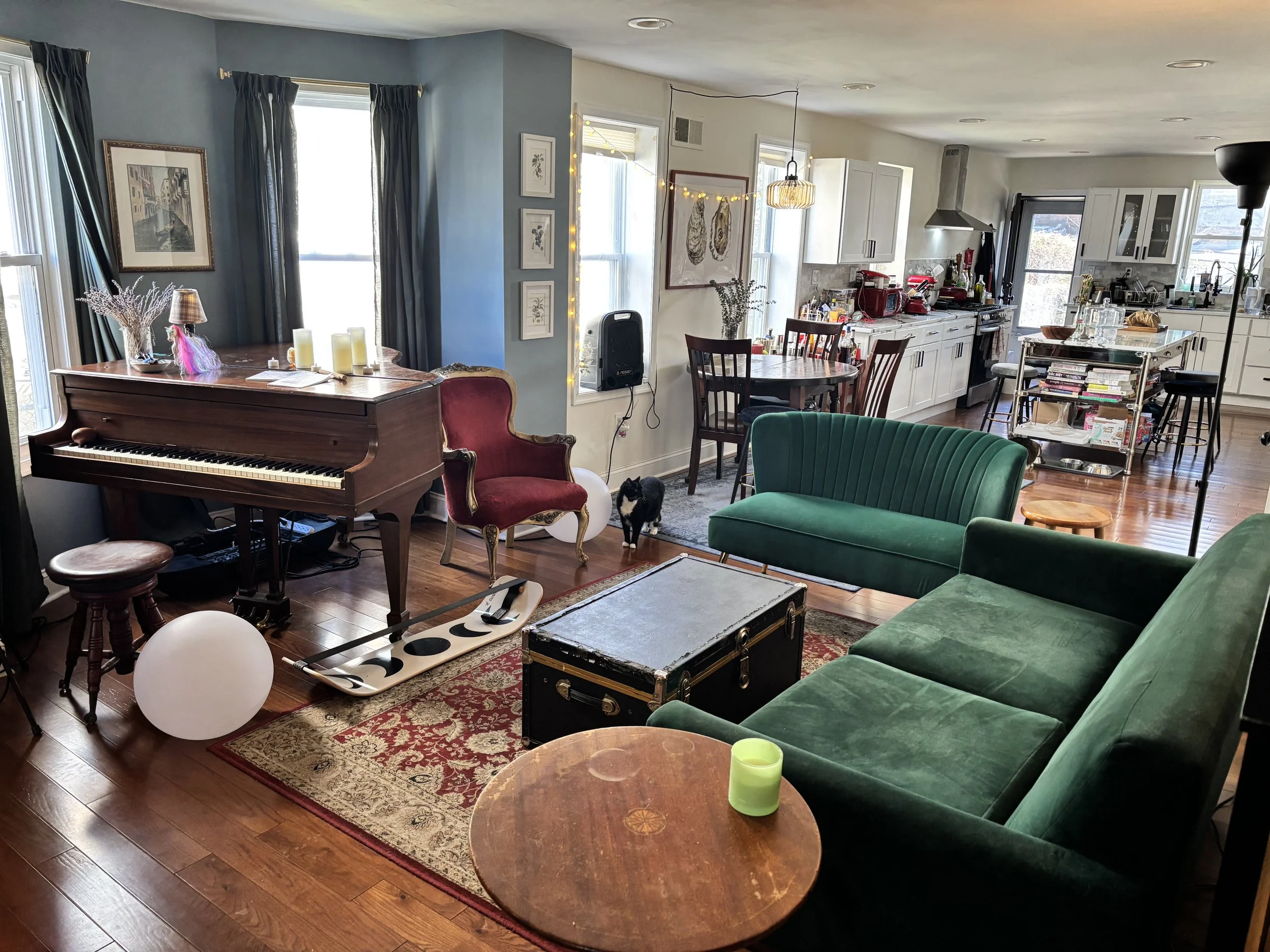 huge open concept first floor living area with lots of natural light, featuring big kitchen, baby grand piano, three couch areas, large TV, sound system, many windows, enclosed front porch with library vibes