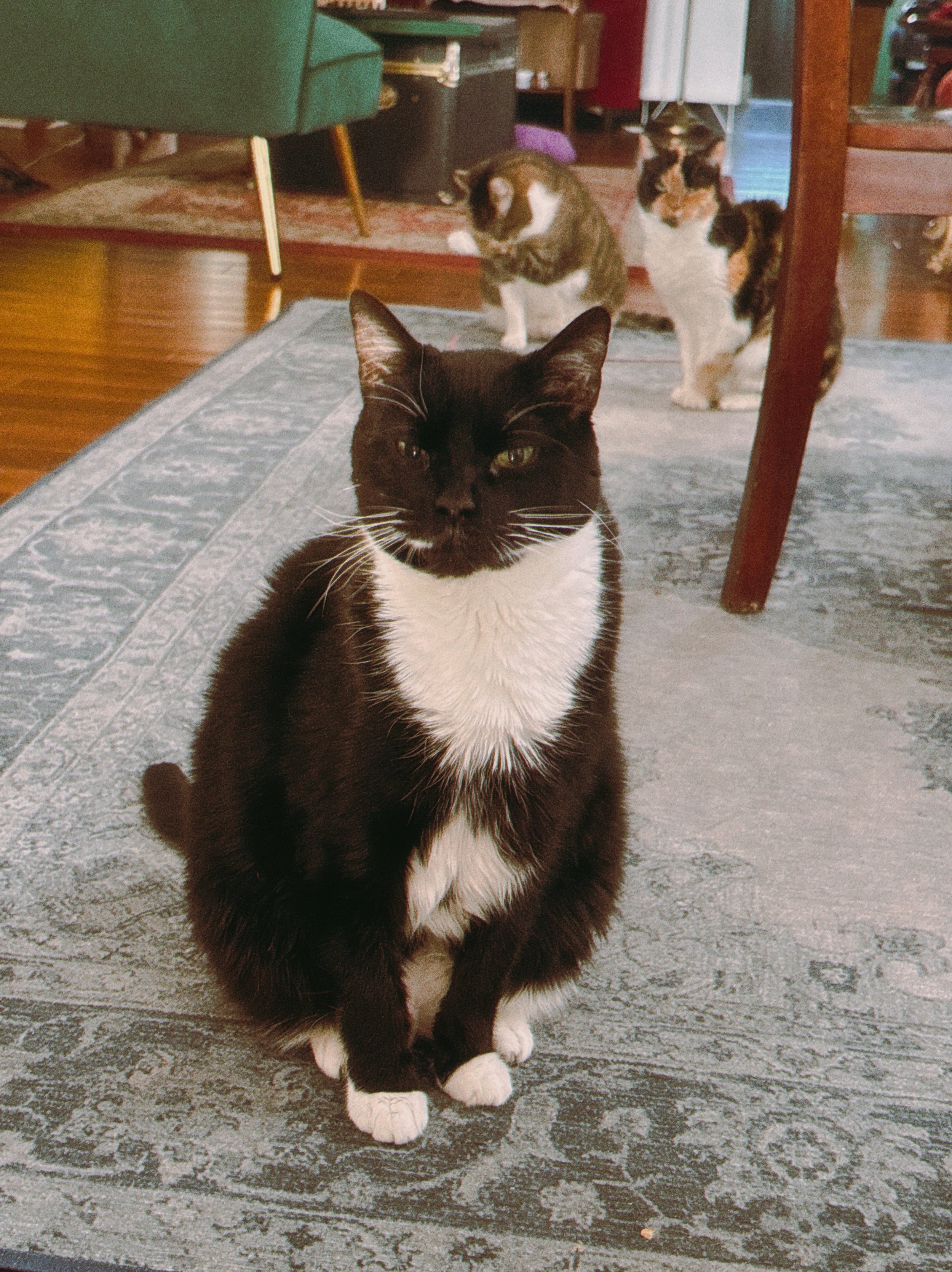 my three cats, Linus, Cordelia, and Scout are delights and will befriend you if you want it.