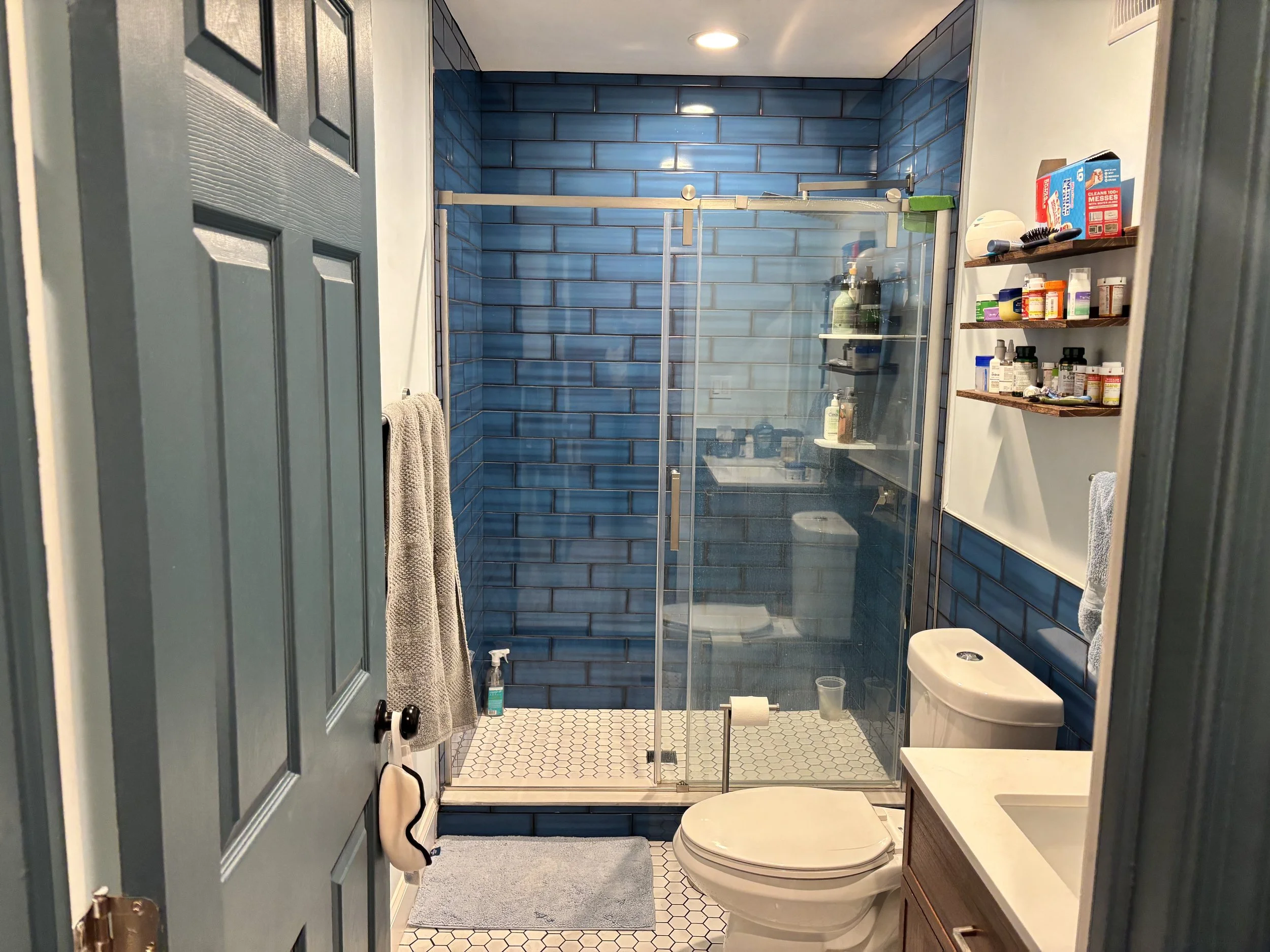 your own private, newly renovated bathroom with subway tile and rainfall shower head