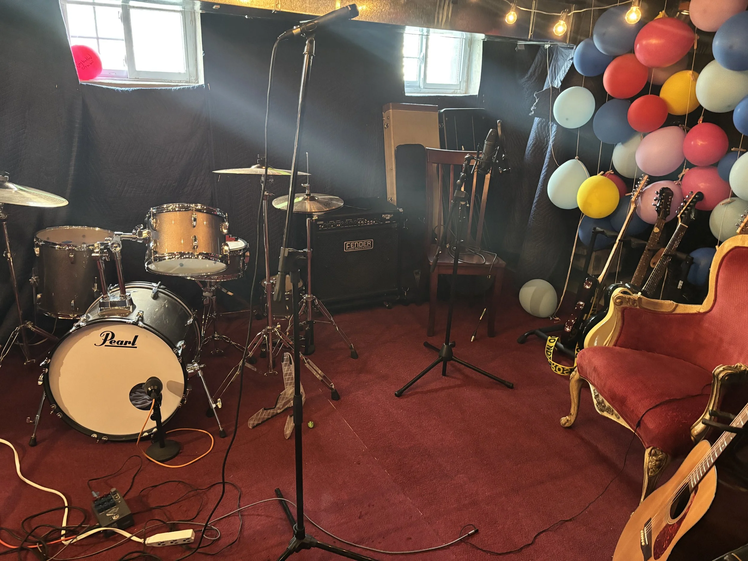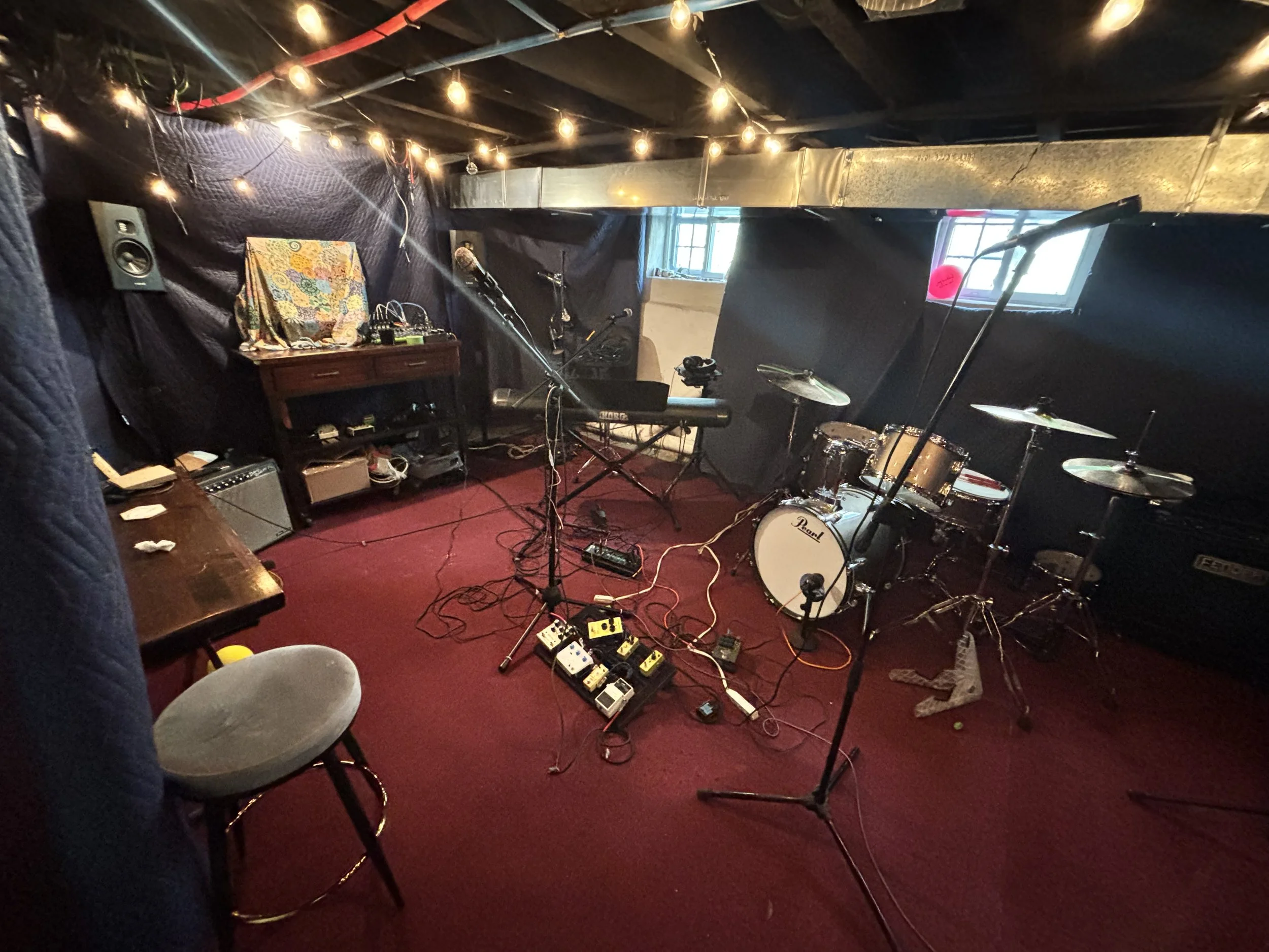 music studio in the basement fully equipped as a rehearsal, songwriting, recording, and mixing space. full backline of everything you need for rock n roll: Pearl drum kit, Fender bass & guitar amps, Korg SV-1, 12 track mixer station (usb equipped), HDMI computer monitor, and Adam audio studio monitors. No PA, but well set-up for headphone monitoring (which is mostly how my band and I use the studio).