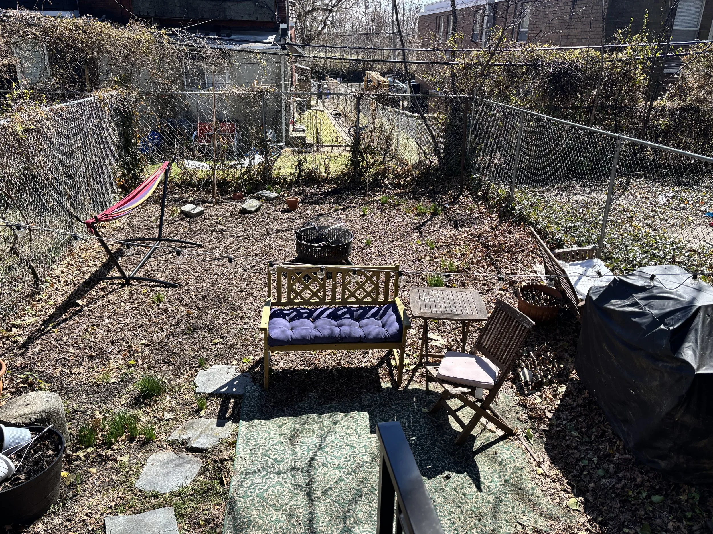 spacious backyard with gas grill. working on making this a flowering oasis featuring cherry blossoms, lots of seating, hammock, and fire pit. perfect for outdoor gatherings.